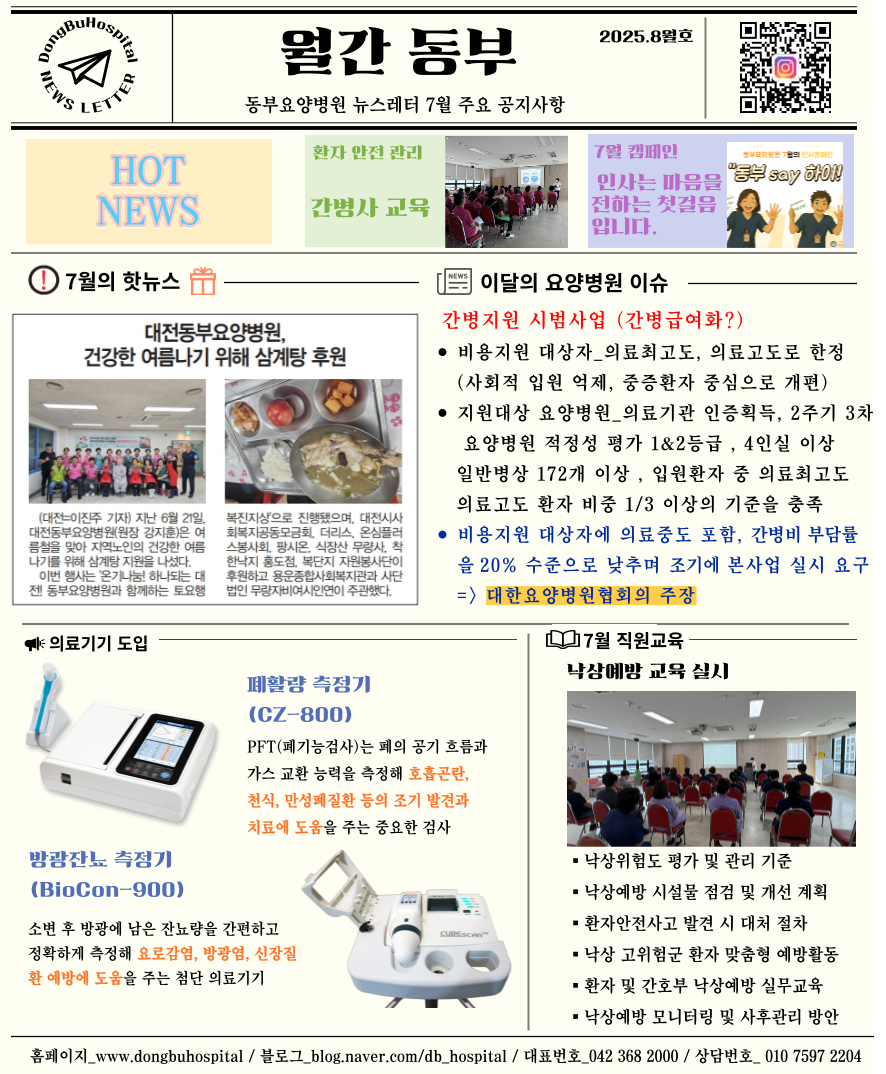 월간동부 8월호 – 무더위를 이기는 건강한 이야기 페이지 정보 작성자 동부요양병원 조회 73회 작성일 2025-11-13 09:25 목록 본문 매월 전해드리는 병원의 소식, 그리고 변화삼계탕 나눔 행사부터 간병사 교육, 의료기기 도입, 낙상예방 교육까지7월의 따뜻한 소식과 유익한 교육 내용을 담은 동부요양병원 뉴스레터 8월호가 발행되었습니다.작은 실천이 큰 변화를 만듭니다! 8월 한 달 동안 동부에서는 자원 절약과 환경 보호를 위한 ‘사무용품 절약 캠페인’을 진행합니다! 관련링크 http://dongbuhospital.com/gnu/data/editor/2511/c0a9c6b89febdf104a3a114… 39회 연결 이전글월간동부 9월호 – 풍성한 가을, 따뜻한 나눔 이야기 25.11.13 다음글월간동부 7월호 – 동부요양병원의 따뜻한 발걸음 25.11.13